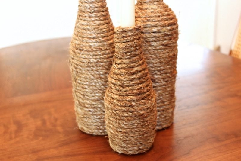 I simply spread hot glue on the bottle and laid the rope on top. I could not live without Mr. hot glue gun! He’s the best!!