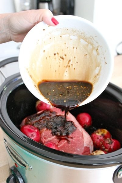 - Place meat and potatoes into crock pot and turn on low heat. Whisk together all the other ingredients and pour over the top of the meat. Cook on low for 6-8 hours.