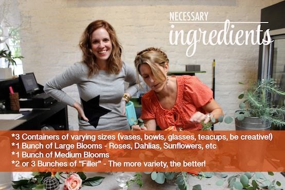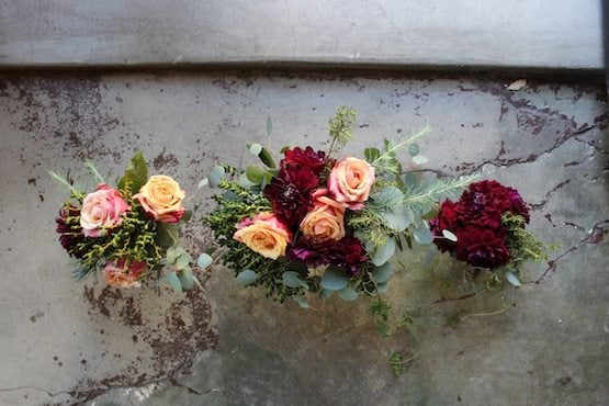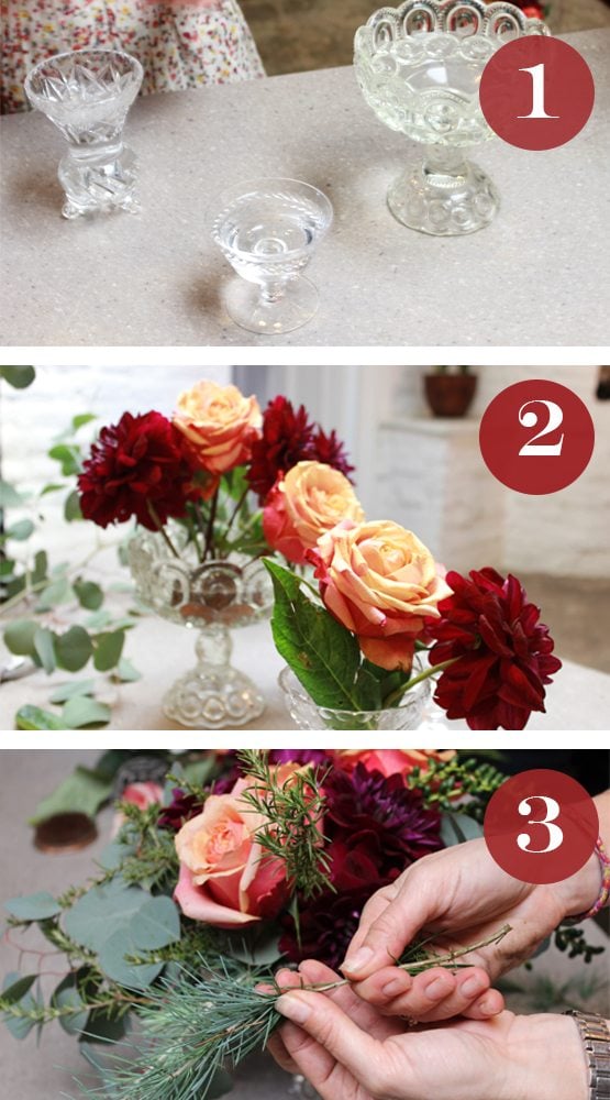 2. Start with a few of your biggest blooms and wrap them together loosely with floral wire or twine. Think of it as a teeny tiny bouquet. Snip off the stems and place it in one of your containers (with water). Now you’ve got the basis to build your piece and the hand tied cluster will work to hold everything in place… quick note, floral foam also works great but only if you don’t have clear glass as a container.