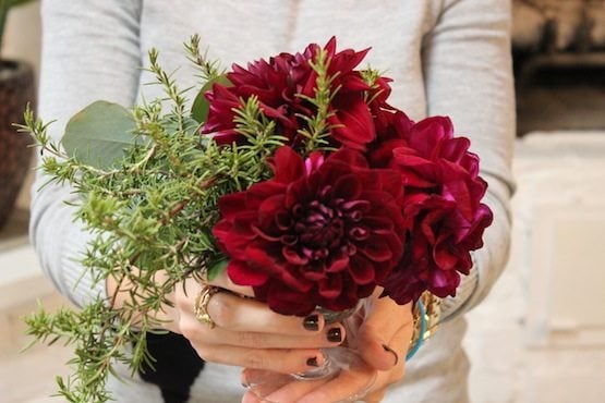3. Add different textures… leaves from the backyard, herbs, branches etc. Tuck each one down into the cluster to hold in place. If it’s tough to wedge your stem, clear the leaves off the bottom so it acts like a little spike to stick down in there.