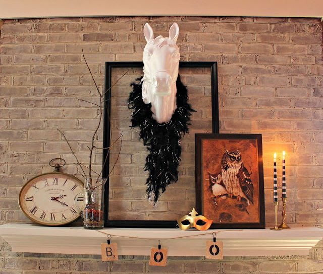 You can easily reuse some of your old costume accessories in your decorating as well. Last year I used a boa and a mask to create my Halloween mantel.