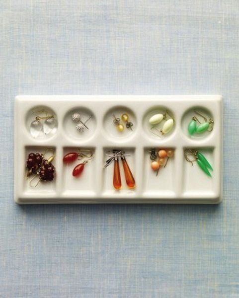 Ceramic watercolor palettes are a fun option. They can separate delicate jewelry and can be stored easily in a drawer.