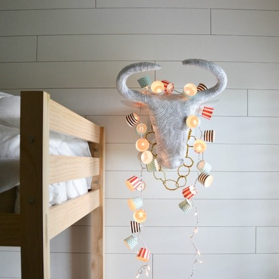 Cardboard Christmas trees as lighting? Why not! You Are My Fave shows you how to make them, but consider that any ole’ shape will work just as well. Maybe you do something geometric, maybe you do numbers or letters… it’s rad either way.