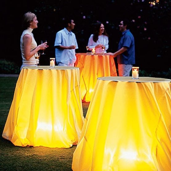 No fire necessary to light up your party in this example. Sunset Magazine simply stored lights under the linens for a gorgeous glowy affect!