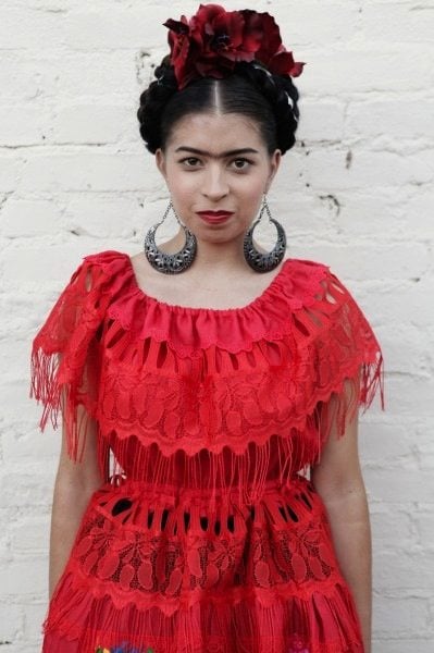A Feisty Frida: Part hair in the middle and create two braids. Attach the ends of braids at the top of your head and add flowers, fresh or fake. Connect your eyebrows with liner and swipe on a few coats of bright red lipstick. Add a festive top and big earrings! So Kahlo!