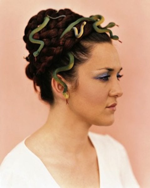 Medusa: Who knew dollar store rubber snakes could be so…chic? Create a complicated updo of your choice (the messier the better!) and weave rubber snakes into your locks. If you don’t have time for intricate braids, toss your hair in a messy bun and start from there.
