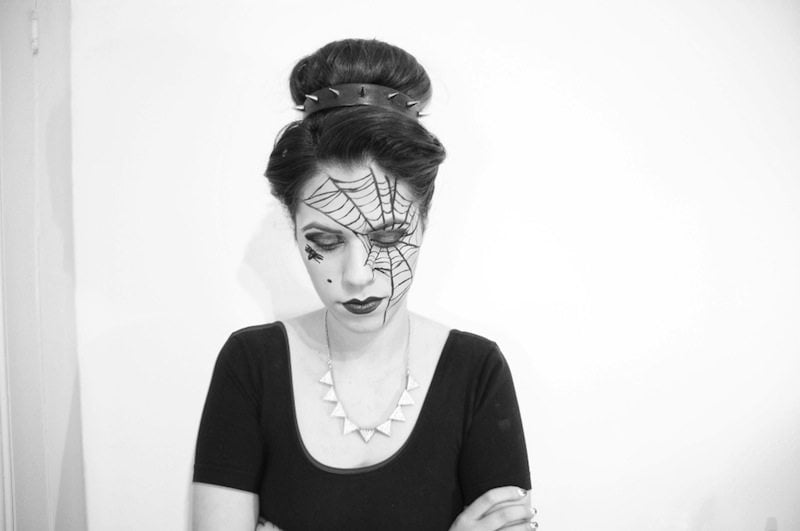 Spider Web: Black eyeliner and a smokey shadow create this chic, creepy crawler look. Draw 10 lines coming out of your eye and connect the web with one inch lines. Add a black long sleeve tee, black jeans and heels. Done!