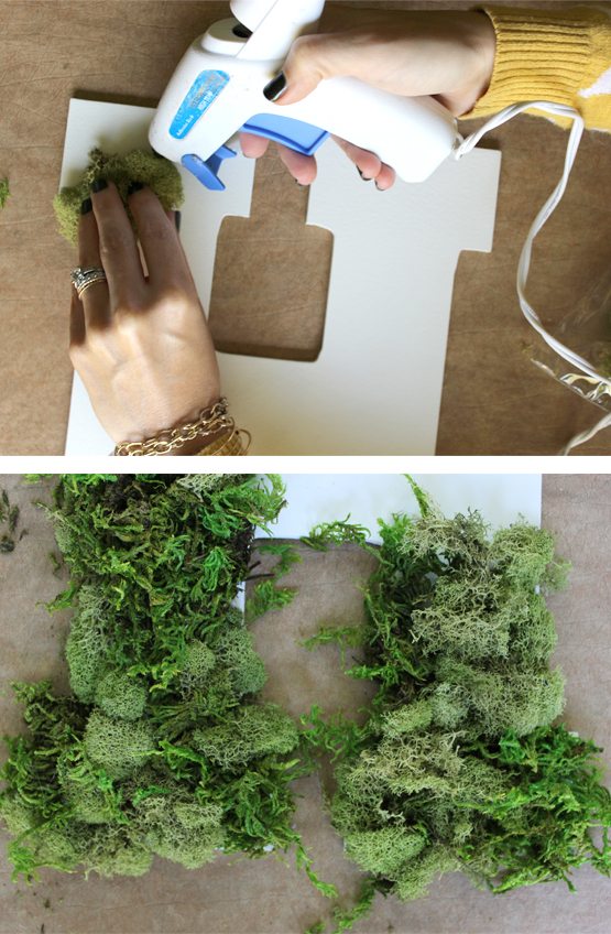 Use your glue to attach the moss to the letter, making sure to cover every square inch (some moss will hang over the edges). Alternate the moss in patches so it feels textural and fun. Use more than you think you need, the only way to mess this thing up is to allow some of the letter to peek through so moss this baby up like the forest floor!