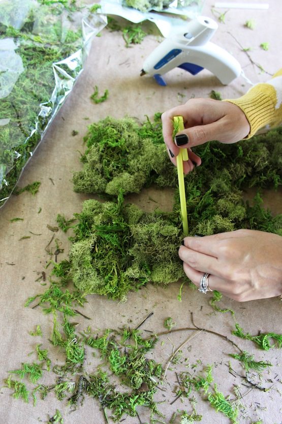 A quick note on not burning your finger prints off… use an implement (I used a straw) to poke the moss down into the hot glue thus eliminating any burn wounds.