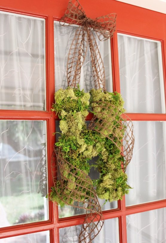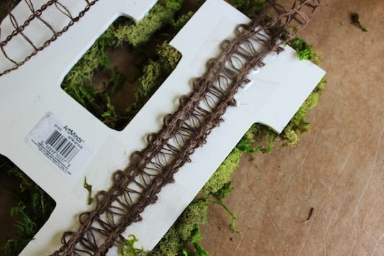 I cut a long length of ribbon (about a yard) and tied the middle in a bow and then attached the to ribbon ends to the back with tape. Because the letter and the moss are so light it worked just fine. You could also loop your ribbon around your letter if it’s more accommodating than an H.