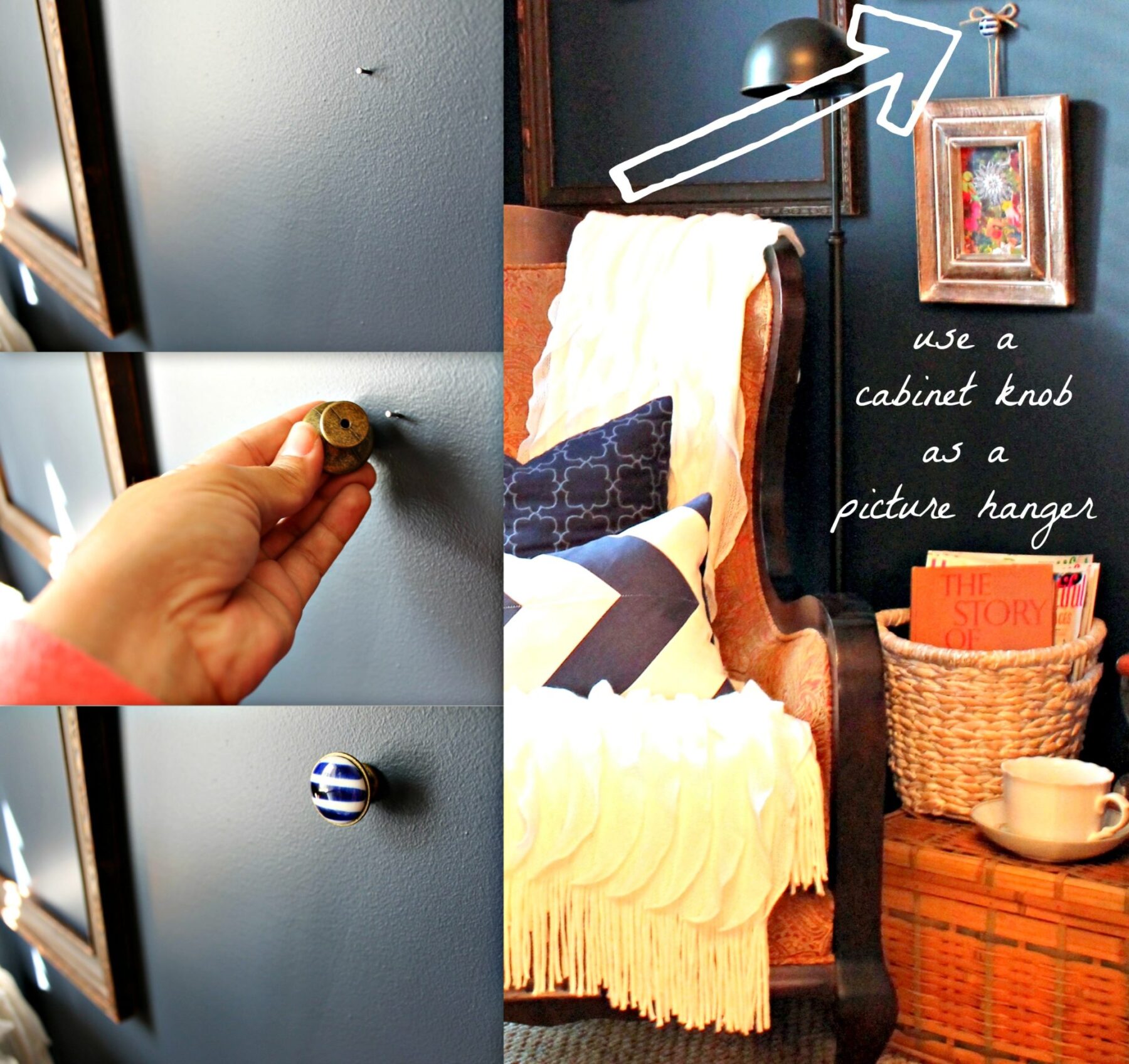 Find out how to turn knobs into hangers with headless screws at Apartment Therapy, or use my simple “cover the nail” trick when you’re hanging something lightweight like a small picture frame. (Tip – Be sure to put the nail in at a slight angel so that the knob will stay in place.)