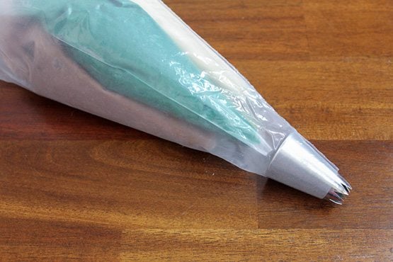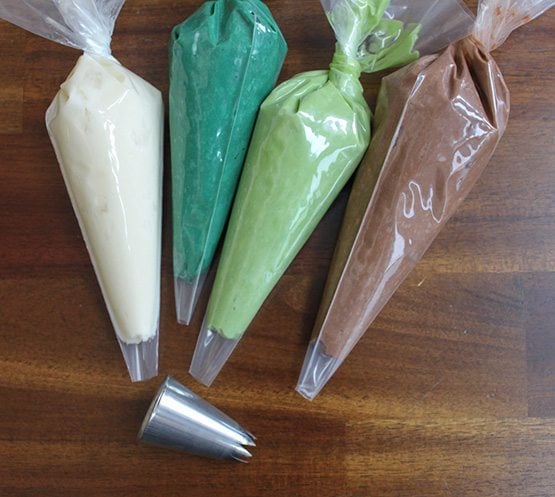 6. Divide the buttercream between four bowls to color with gel-paste. Add a couple drops of color into each bowl, leaving one bowl plain white. Transfer colored buttercream into small pipping bags (pastry bags or zip lock bags). Cut small openings in bags. Have desired piping tip ready.