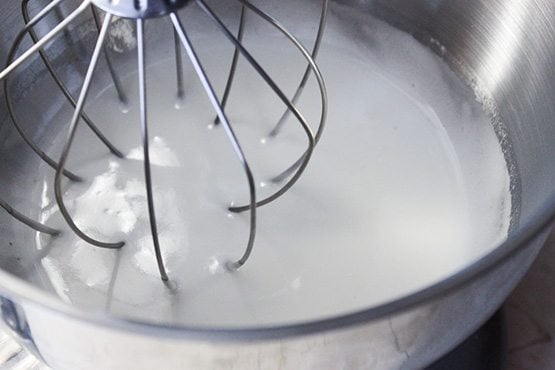 3. Attach bowl to stand mixer fitted with whisk attachment. Starting on the low speed setting, whisk mixture. Gradually increase speed to medium-high and whisk until stiff peaks has formed. At this point, the meringue mixture will be fluffy and shiny.