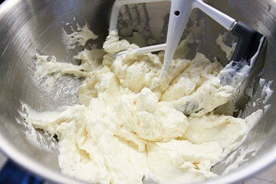 4. At this point the meringue mixture should have slightly cooled, around room temperature. Add softened, room temperature butter a couple tablespoons at a time. Once all the butter has been added, switch to a paddle attachment.