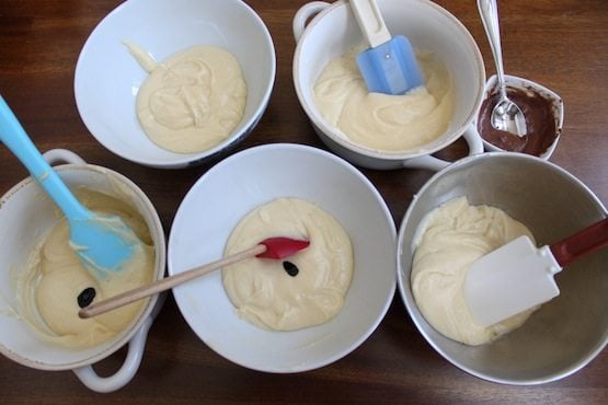 5. Add 1/3 of flour mixture to stand mixer bowl. Mix on low speed until almost combined. Add 1/2 of milk mixture. Mix until almost combined. Repeat with another 1/3 of flour, followed by remaining milk mixture. End with flour mixture and mix until there are no more dry streaks of flour in the batter. Divide batter between 5 small bowls (about 1/2 cup of batter each).