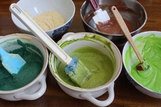 6. In a small saucer, mix together 1 Tbsp cocoa powder with 1 Tbsp hot water. Stir until a liquid-paste forms. Add cocoa mixture to one of the small batter bowls. Set aside one bowl to keep white, color the remaining bowls of batter with desired gel paste colors.