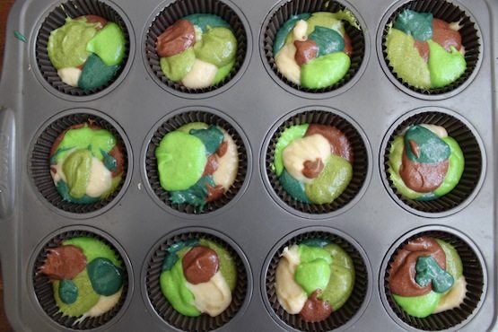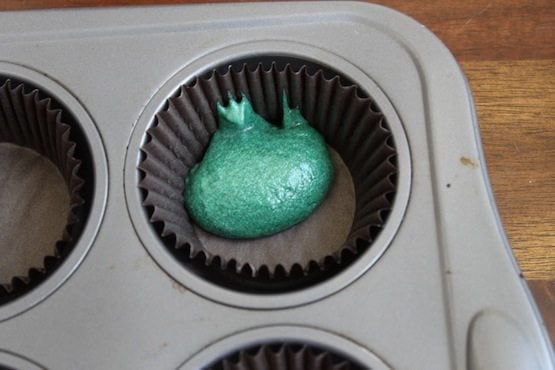 7. Add dollops of each color into the prepared, lined muffin tins. Add enough batter until muffin tins are a little more than 1/2 full.