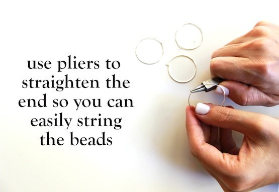 The earrings I used had a hole at one end and a bent in that fed through that hole and held it in place. In order to slide the beads on easily you need to straighten the bent in first.