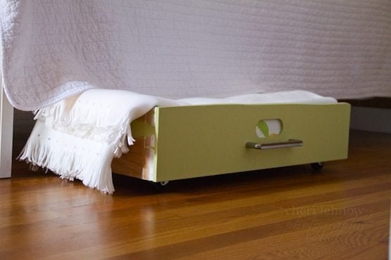 A lone dresser drawer can instantly be transformed into under bed storage like this one photographed by Cheri Lehnow Photography. Installing some wheels on the bottom of the drawer makes it more accessible and less likely to scratch your floors.