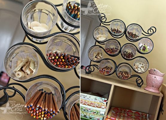 Combining a wine rack and glasses creates this office supplies organizer. Such a clever idea by Triple The Scraps! Wine racks can also be used to store rolled up magazines or small towels. Give it a try!