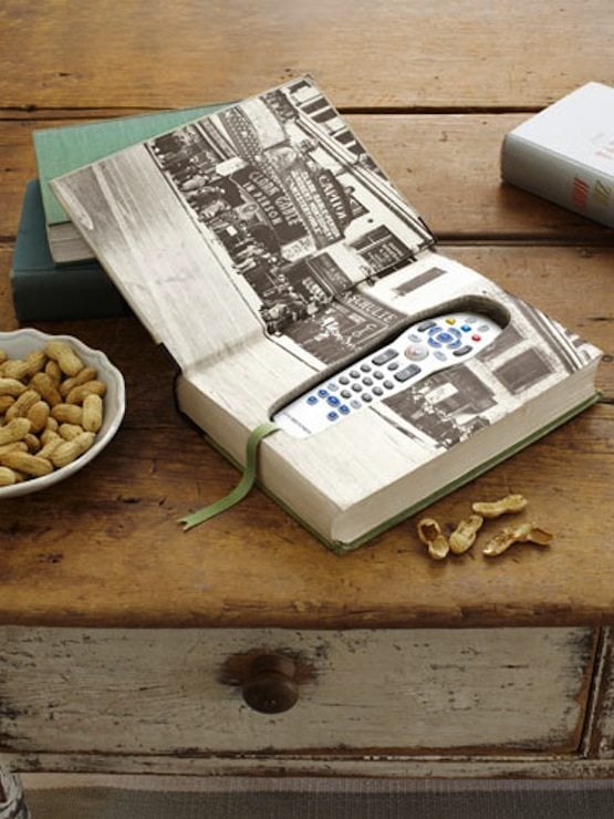 Although cutting up a book is typically bad form, I think that there are a couple exceptions to the rule. One exception? This DIY remote storage shown here by Country Living.