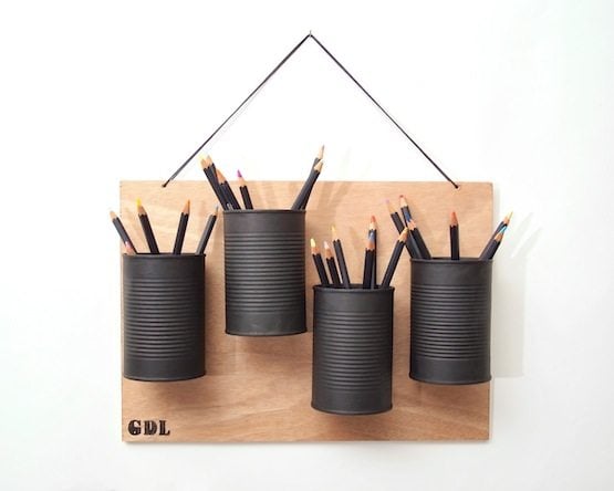 Spray paint some cans as a super thrifty pencil holder. Here Wantcy took this idea a step further and made an artistic pencil storage wallhanging.