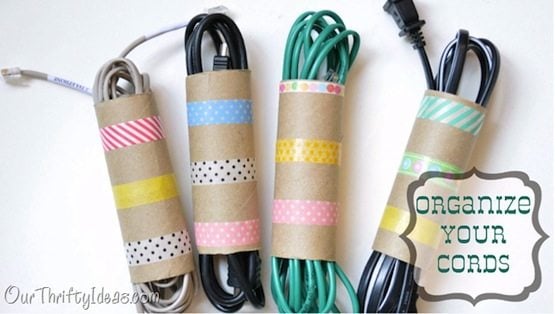 It’s safe to say that we all can fall victim to a mess of cords from time to time, so try this as an easy DIY storage trick! Our Thrifty Ideas adds a little bit of washi tape to the toilet paper rolls and has instantly colorful AND tidy cord organizers.