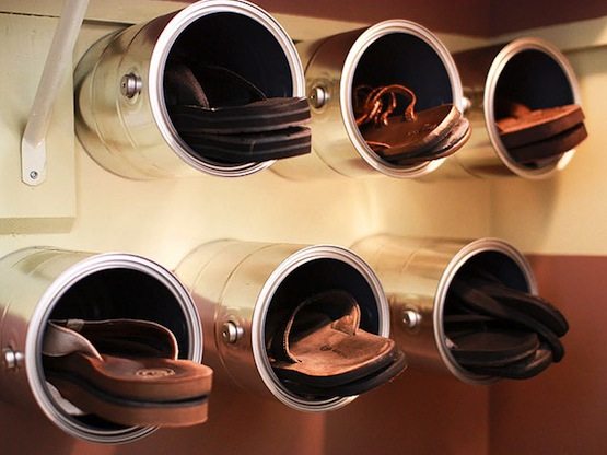 By drilling paint cans into the wall, Crafty Nester created this unique flip flop storage. This is such a clever way to get your shoes up off the floor while also recycling those old paint cans!
