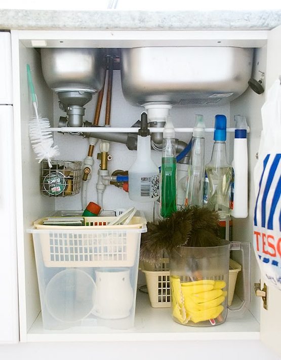 While most people use tension rods for their shower curtain, A Thousand Words blog shows us how repurposing a tension rod as a bottle hanger can free up a bunch of space under the sink.