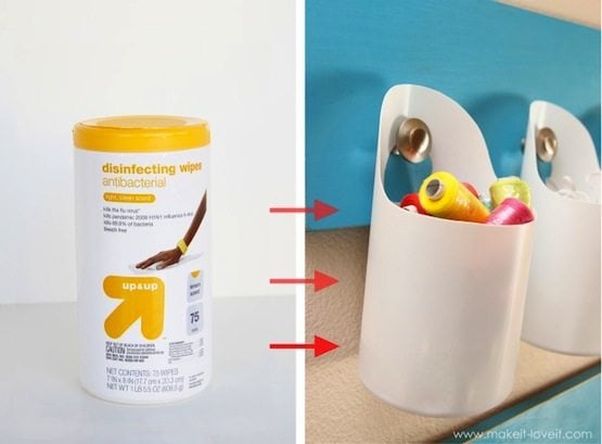 Make it & Love it is so stinkin’ good at making old bottles into new storage items that I had to share this one too. Here she cuts up a disinfecting wipes container and makes a hanging storage unit. Amazing!!