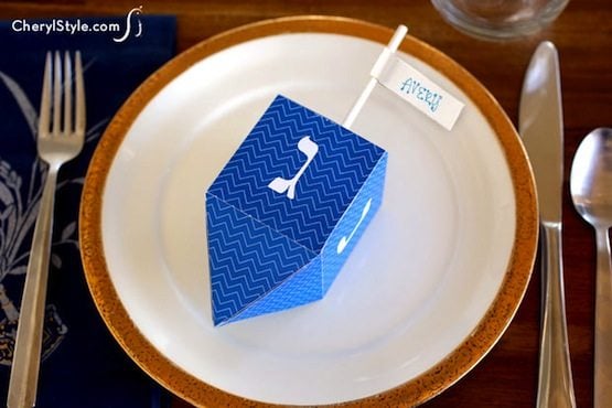 These printable dreidel place cards from Cheryl Style are stuffed with candy so your dinner guests will leave with a treat for later.