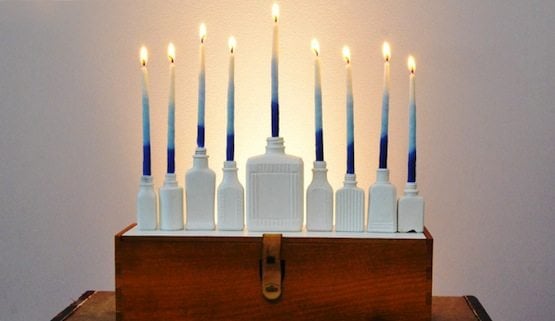 Mismatched bottles suddenly look cohesive with a bit of paint. This upcycled menorah by Mr. Kate definitely gets its “cool” factor from the multi-toned taper candles.