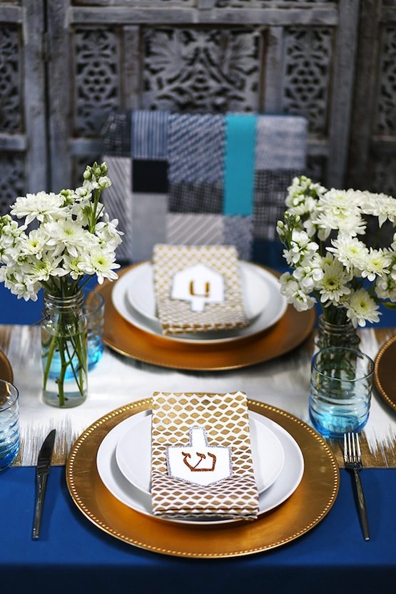 Gold, gold GOLD! This table scape by Quinn Cooper style is so gorgeous! My eyes are going to those glittery DIY place cards on top of the linen napkins. Make these dreidel place cards out of card stock and glitter to add some polish to your table.