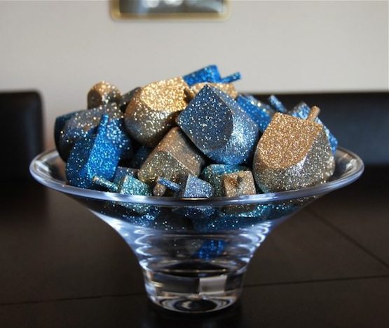 Add some glitter to wooden dreidels, throw them in a glass bowl, and Vuala! You’ve got a sparkly centerpiece like this one from Felt So Cute!