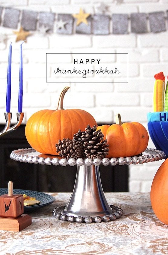 Placing some pumpkins and pinecones on a cake stand next to pretty blue menorahs is definitely a striking decor idea for Thanksgivukkah. I’m especially loving the silver accents! Check out the complete look at Bunny and Dolly.
