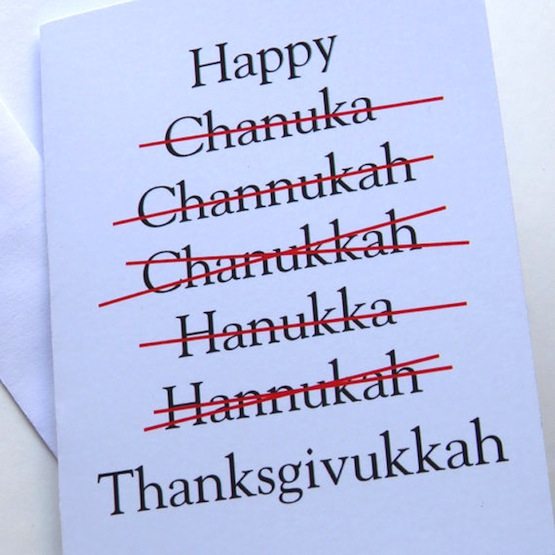 A DIY card for this year’s deemed “Thanksgivukkah” is as simple as printing these words on some white card stock paper and adding the red lines by hand. You can also just purchase some pre-made ones on Etsy.