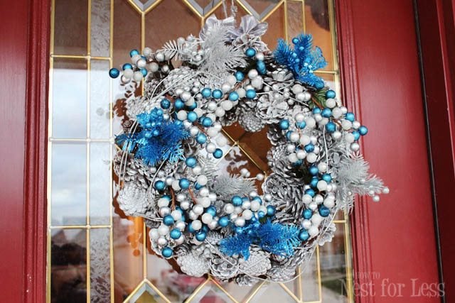 This blue and silver pinecone wreath is %100 do-it-yourself. I love that How to Nest for Less used this metallic silver spray paint.