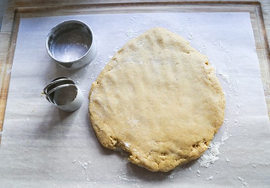6. In the meantime while the oil is heating up, remove dough from fridge. Dump chilled dough out onto a floured surface. Using your hands, pat dough to an even thickness, about 1/2-inch thick. Gather two round cutters, a large one to cut out the donut and a smaller one to cut out the donut hole centers.
