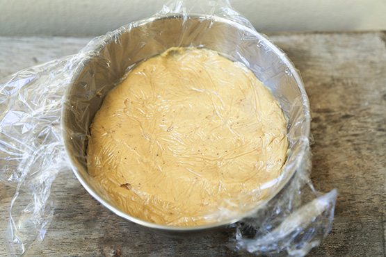 4. Scoop out batter and transfer to a clean bowl. Cover with plastic wrap, allowing plastic wrap to sit directly on top surface of dough. Let dough chill in the fridge for at least one hour (dough can remain in the fridge for up to 24 hours).