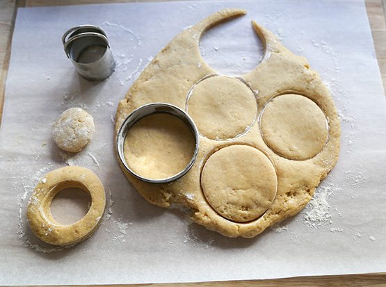 7. Dunk cutters in flour before punching out shapes. Continue to flour cutter before cutting out each circle, to ensure that the cutter does not stick to the dough. Take any remaining dough and pat together to 1/2-inch thickness. Cut out additional donuts.