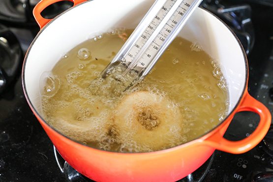 5. In a large pot (I used a dutch oven), pour about 3 inches of vegetable oil. Set over medium-high heat. Place candy thermometer (or food-safe thermometer) in pot and allow oil to heat to 370 degrees F.