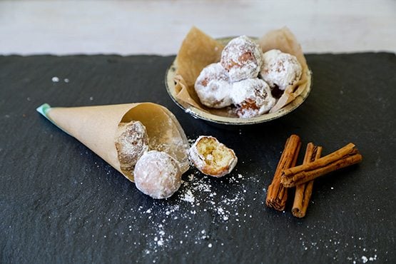 1. Sift together confectioners’ sugar, cinnamon and nutmeg. Place in a bowl. Coat donut holes in cinnamon sugar powder mixture.