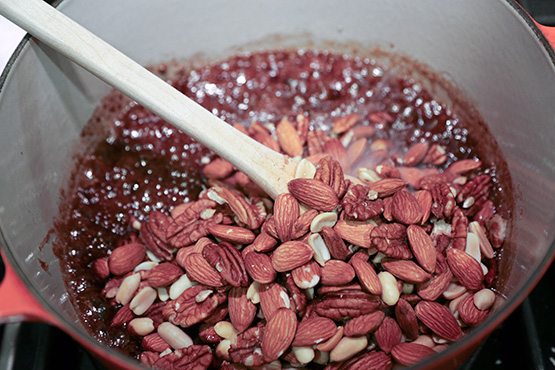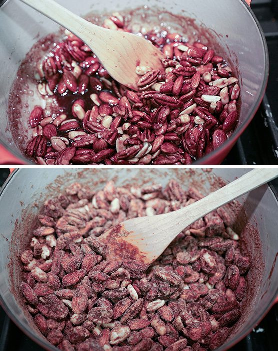 2. Once sugar mixture starts to bubble, lower heat to medium-high and add nuts of your choice. Using a wooden spoon (or heat proof spatula) stir nuts continuously. Continue to stir and agitate liquor sugar mixture. It may take anywhere from 3-7 minutes, but be consistent and keep stirring!