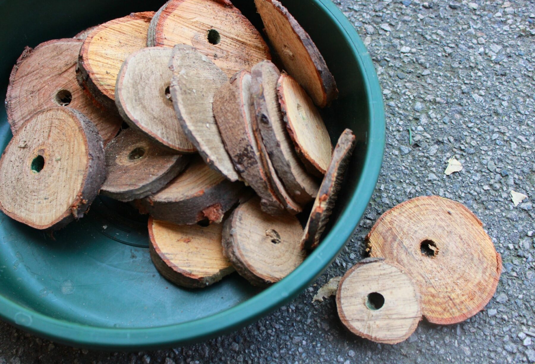 When we were wandering around the Christmas Tree Lot this weekend I noticed these little wood pieces all over the ground. They’re the ends of the tree trunks that they trim to make the tree the right height for customers but from where I was standing… they sure looked an awful lot like a craft project to me!