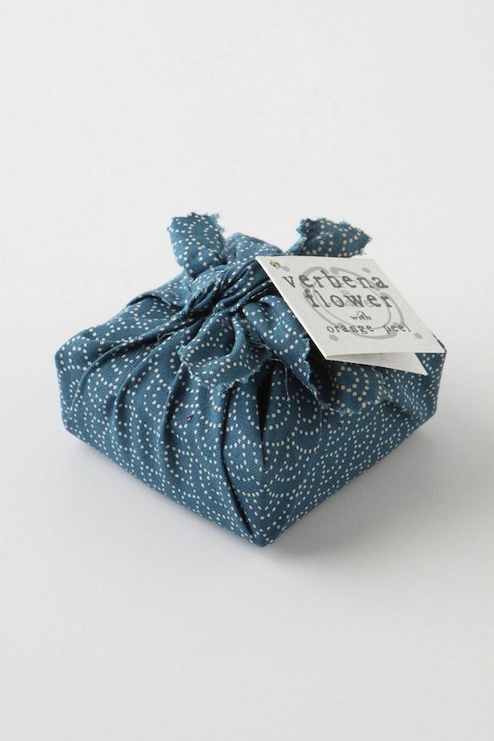 This wrapping is from Anthropologie who used a pretty piece of cloth to wrap up their package.