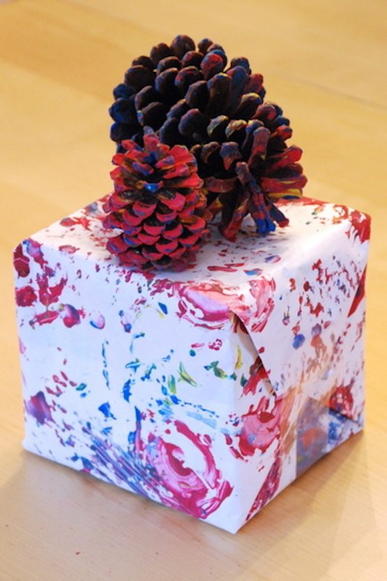 Get the kiddos involved with this idea from Home Grown Friends. Use a Pinecone to paint the paper AND top the gift!