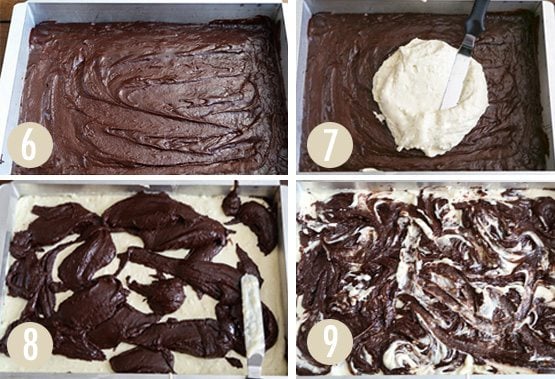 9. Using a mini offset spatula or a knife, swirl together the top brownie layer and cheesecake layer.