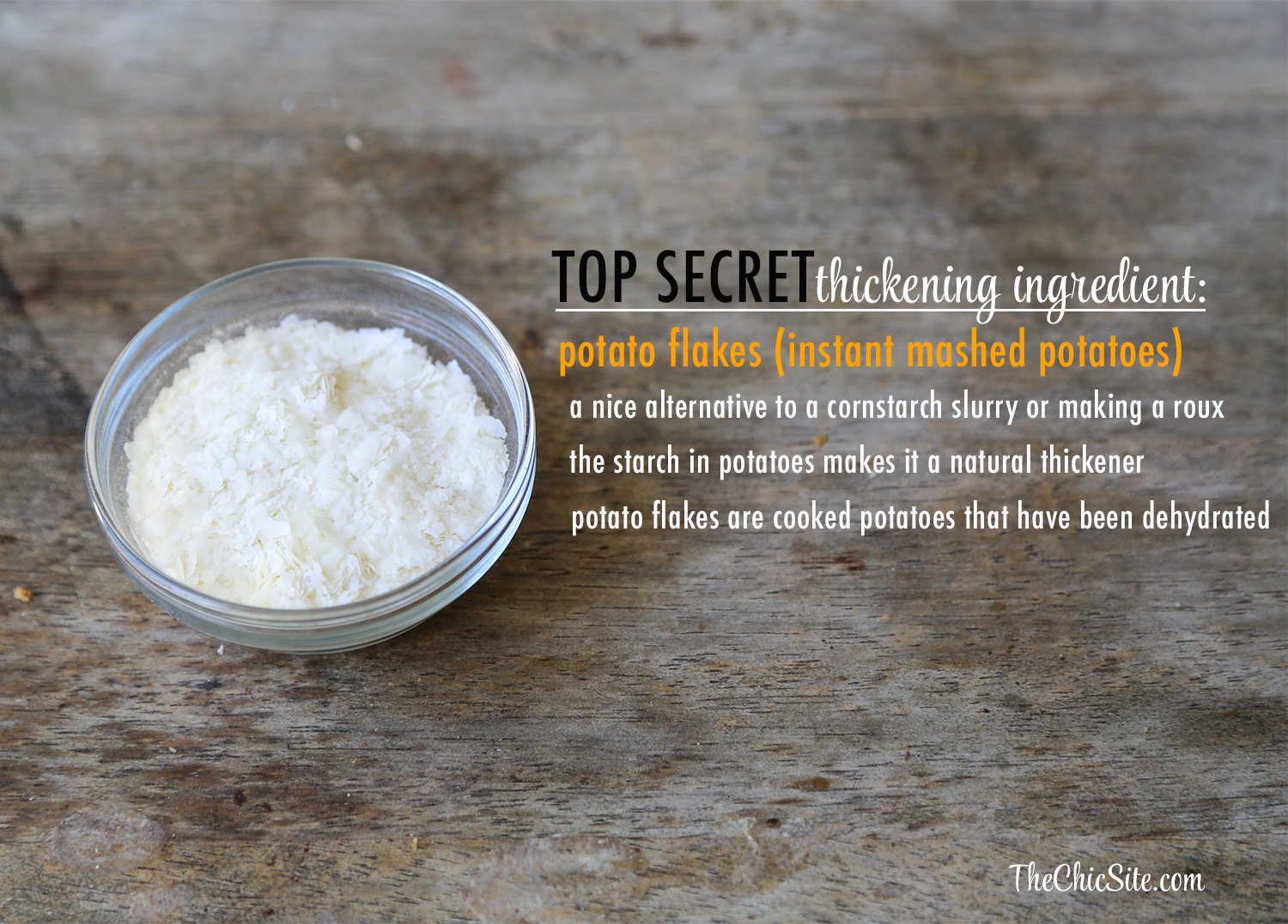 And my top secret ingredient in thickening this stew- potato flakes (instant mashed potato)! While I’ve never made mashed potatoes from a box, I do love using instant mashed potatoes as a thickener. It is a nice alternative to using cornstarch or making a roux. You simply add the potato flakes into the hot stew, stir to combine and it instantly thickens. The starch in potatoes make it a natural thickener. And don’t worry about using instant potatoes- they are made using real potatoes that have been cooked then dehydrated.
