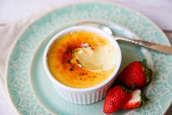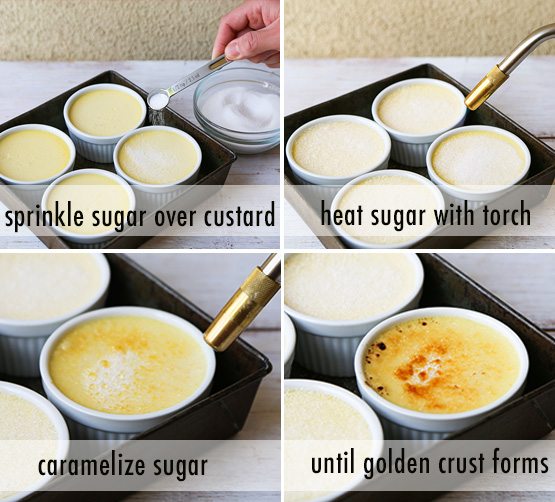 4. When ready to serve, remove chilled custard from fridge. Sprinkle about 1/2 tsp- 1 tsp of granulated sugar over each custard. Using a kitchen torch, melt and caramelize the sugar on top until a nice golden crust forms. Serve immediately.
