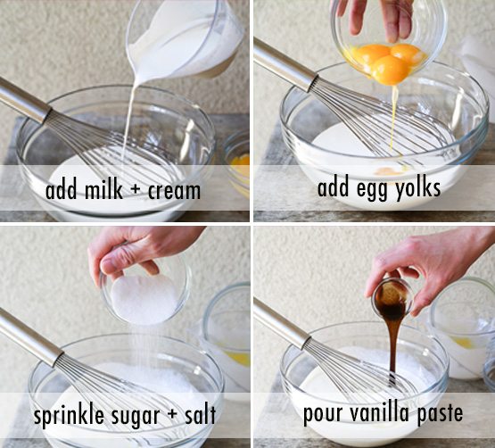 1. In a large bowl, whisk together heavy cream, milk, yolks, salt, sugar, and vanilla. Whisk until combined and sugar has dissolved. Pour mixture into a large container with a spout.